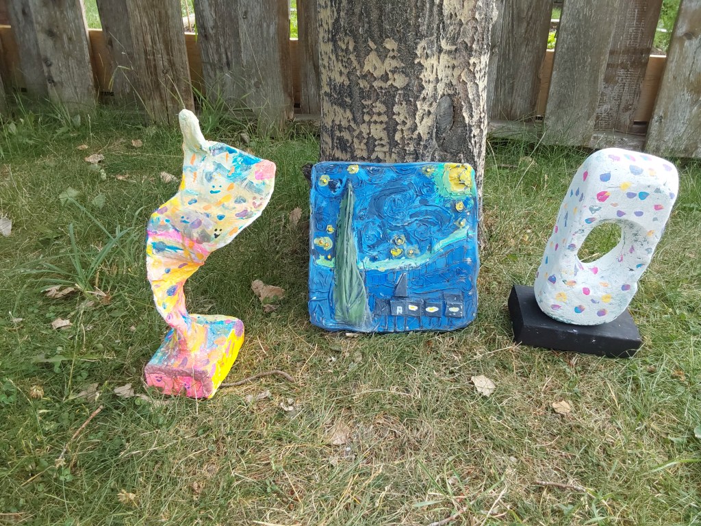 I made these art pieces at my art camp. I call this art piece the fun tornado. This piece is called a free form sculpture. That means we could make it into any shape we wanted. I made this piece out of plaster. When you get. Plaster, wet, it’s kind of like tape. This piece…