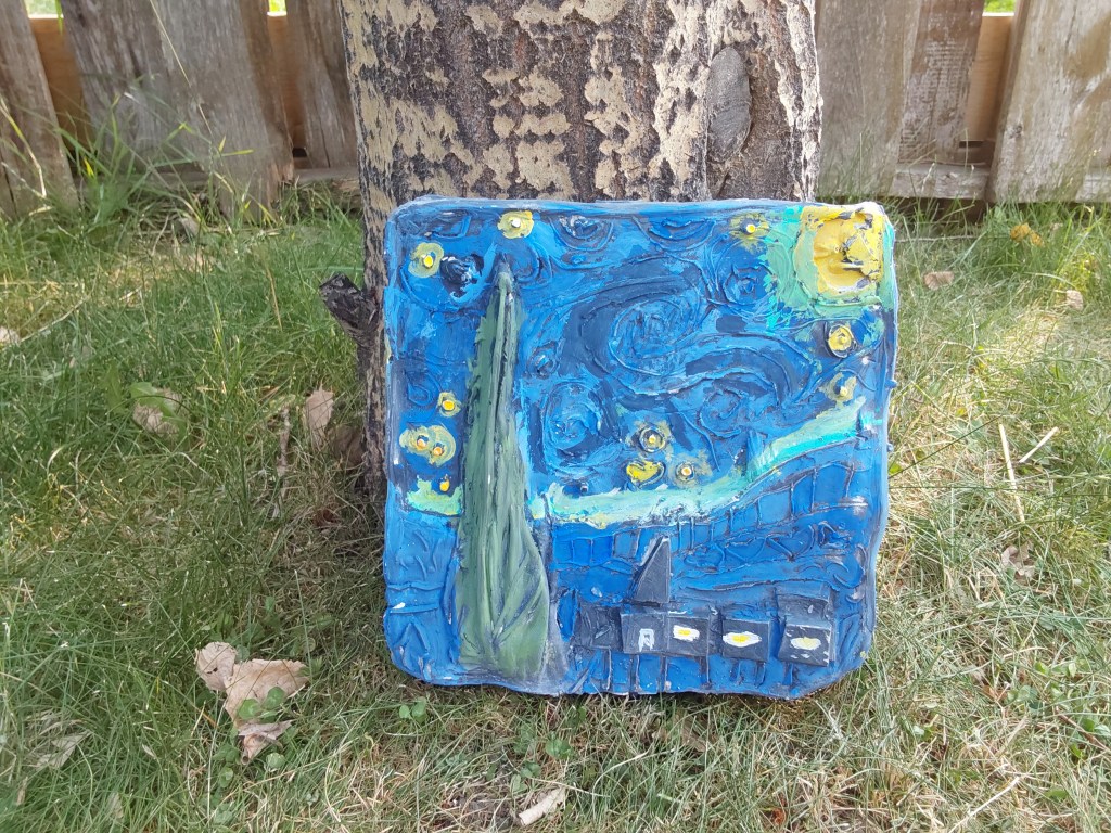 This piece was originally a painting. Buy a man Named Vincent Vangogh. But we turned it into a sculpture. This painting is called the starry night.